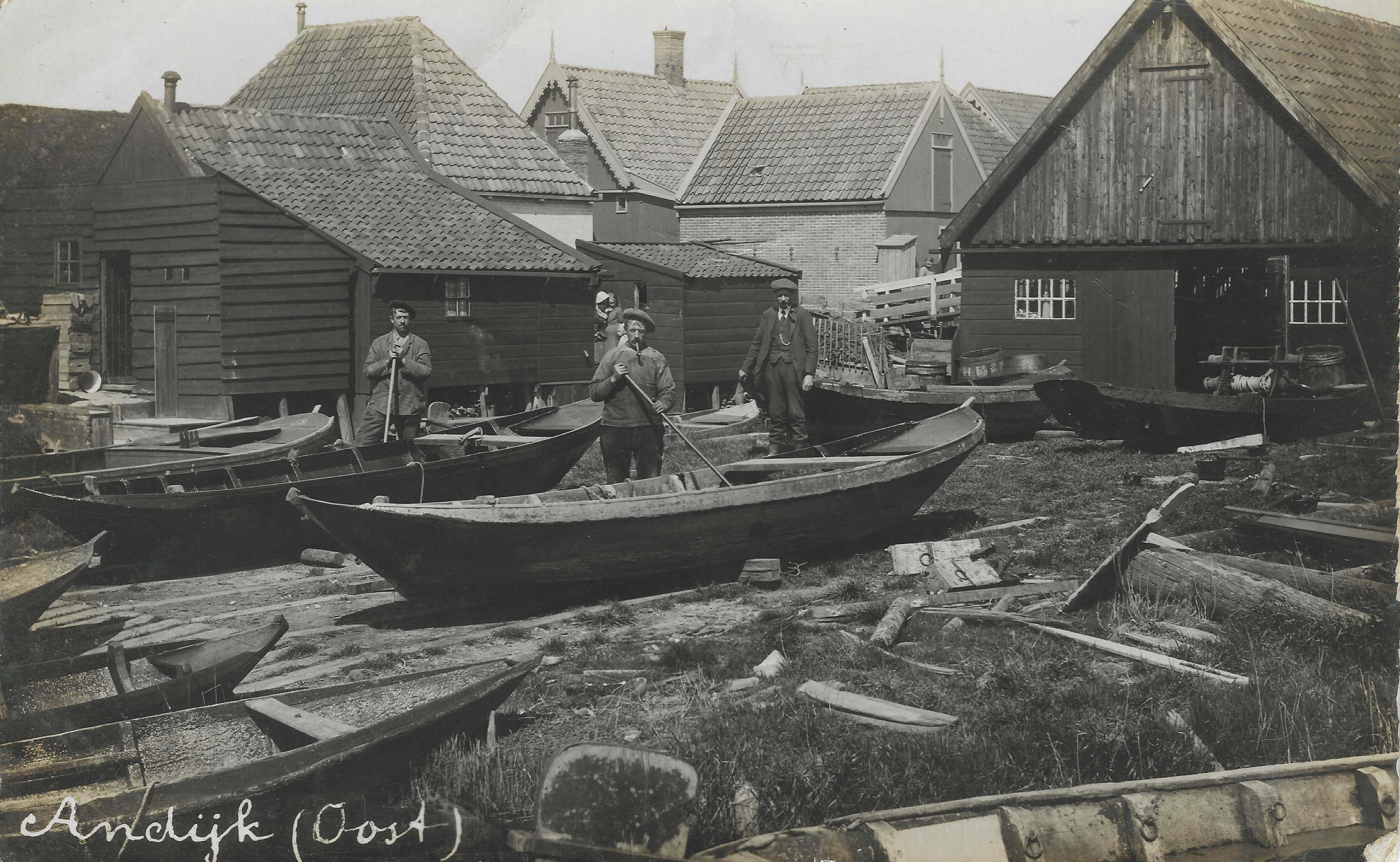 Nu het voorjaar is worden de schuiten nagekeken en voorzien van een nieuwe teerlaag. Voor fotograaf Piet Jonker worden de werkzaamheden even stilgelegd. Die komt tenslotte niet iedere dag langs. Rechts op de voorgrond zien we een koe-praam met aan elke spant een ijzeren ring waar de koeien aan vast kunnen worden gemaakt. Links een houten boetje met stapel potersbakken. De man in pak is winkelier Dirk Burger uit de Vinkenbuurt.