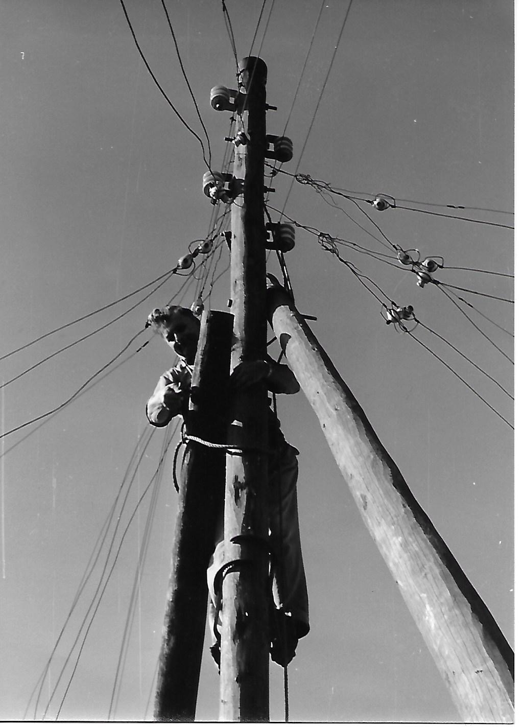 Piet Bakker met z’n klimschaatsen in de elektriciteitsmast